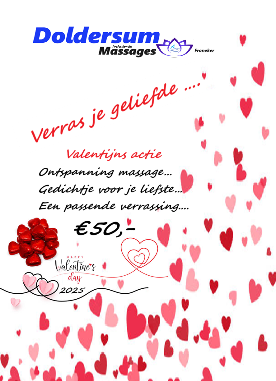 Verras je geheime liefde met een Valentijns massage. Een heel relaxt cadeau wat zeker in de smaak valt van je geliefde.... Doldersum Massages bied dit arrangement aan in de week van 14 februari.
